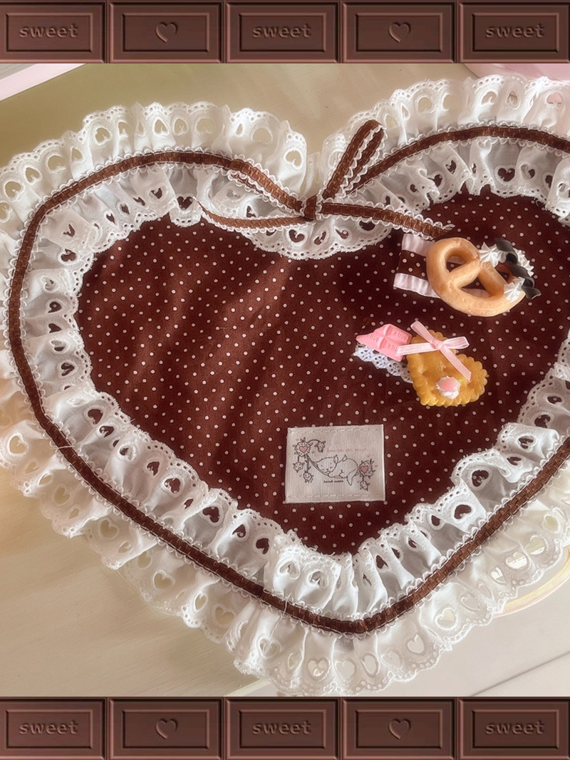 초코색 도트 원단에 테두리는 프릴 가득 , 리본을 장식하여